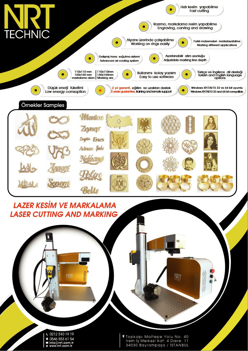20 watt, 30 watt, 50 watt ve 100 watt güçlerde üretilen NRT Fiber Lazer Sistemleri masaüstü yapısıyla kuyumculuk ve diğer sektörlerde standartların fazlasını sağlayan ergonomik ve dayanıklı bir yapıya sahiptir. Bu yapı sistemin uzun ömürlü ve bakımsız olmasını sağlamaktadır.
